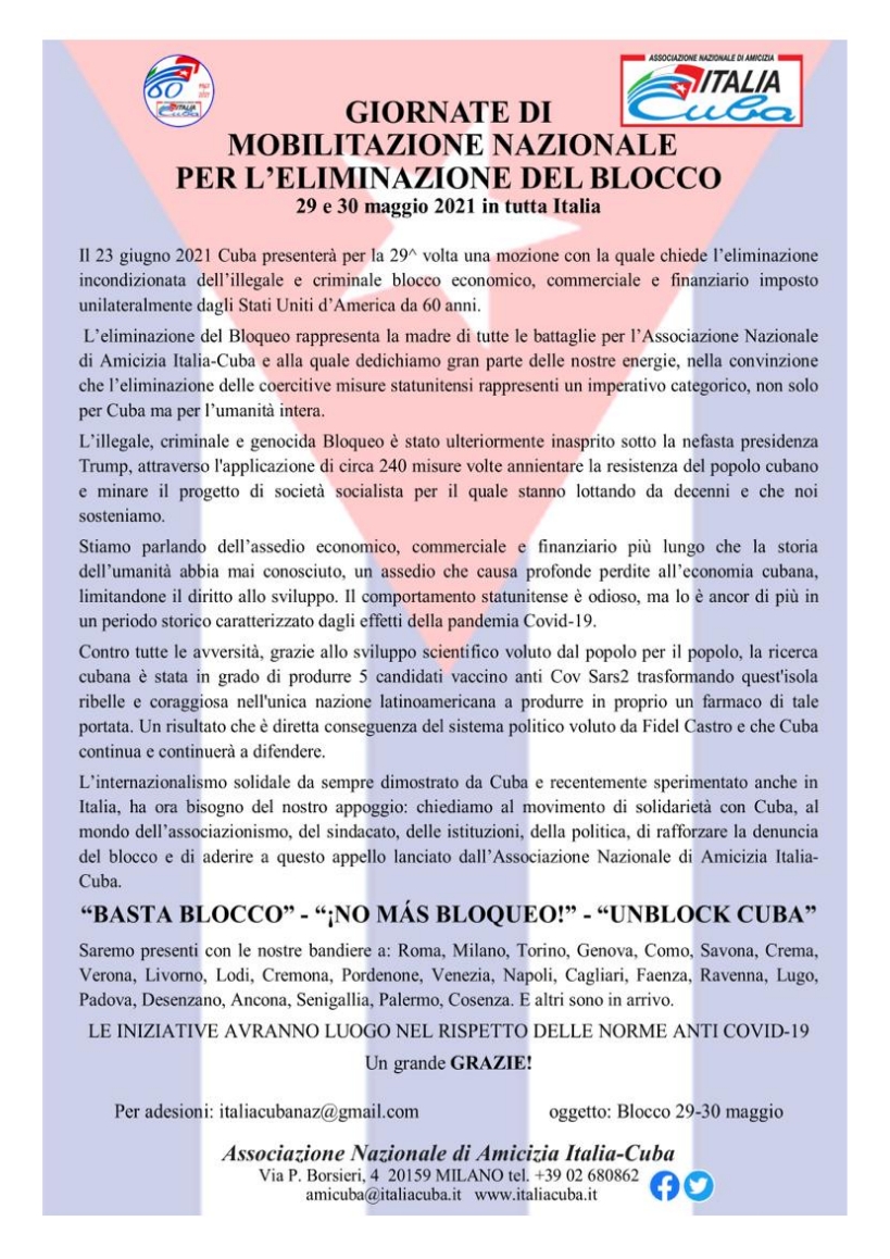 29-30 maggio 2021 - Giornate di mobilitazione nazionale per l'eliminazione del blocco contro Cuba. Il Circolo Italia-Cuba di Padova parteciperà all'iniziativa il 29 maggio dalle ore 17:00 alle ore 18:00.