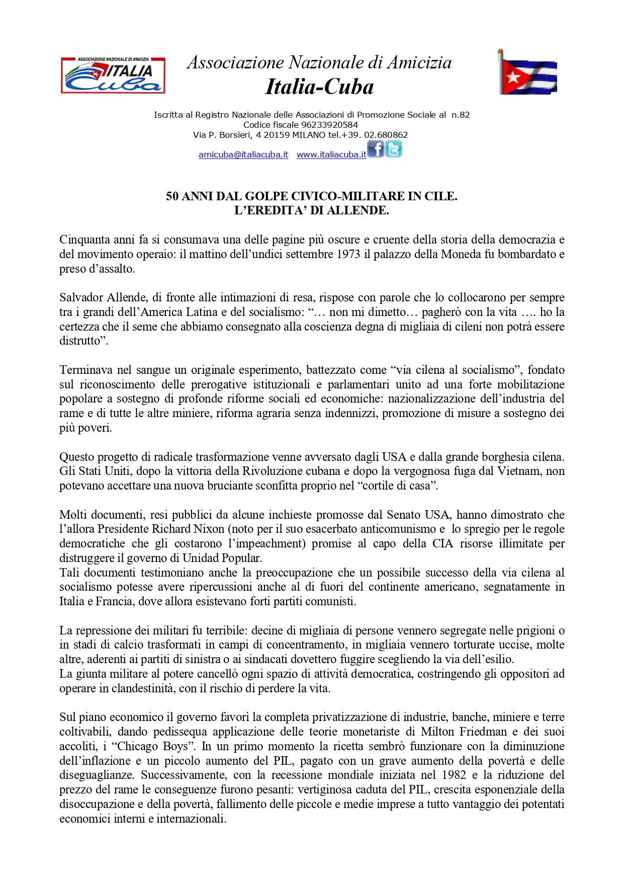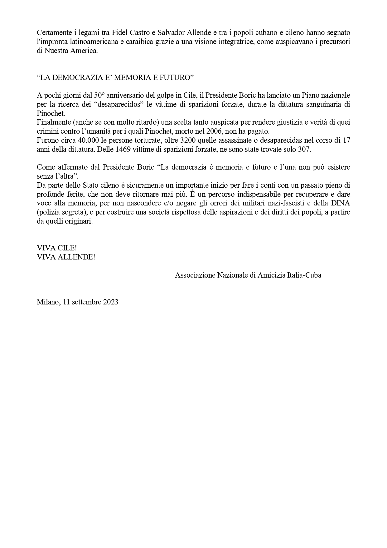 Cinquanta anni fa si consumava una delle pagine più oscure e cruente della storia della democrazia e del movimento operaio: il mattino dell’undici settembre 1973 il palazzo della Moneda fu bombardato e preso d’assalto.
